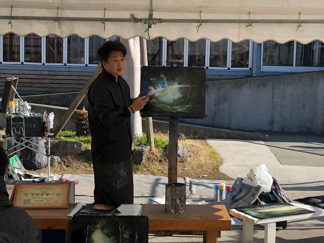 満足して外に出たら、なにやら屋外パフォーマンスをやってました。スプレーで絵を描くやつです!